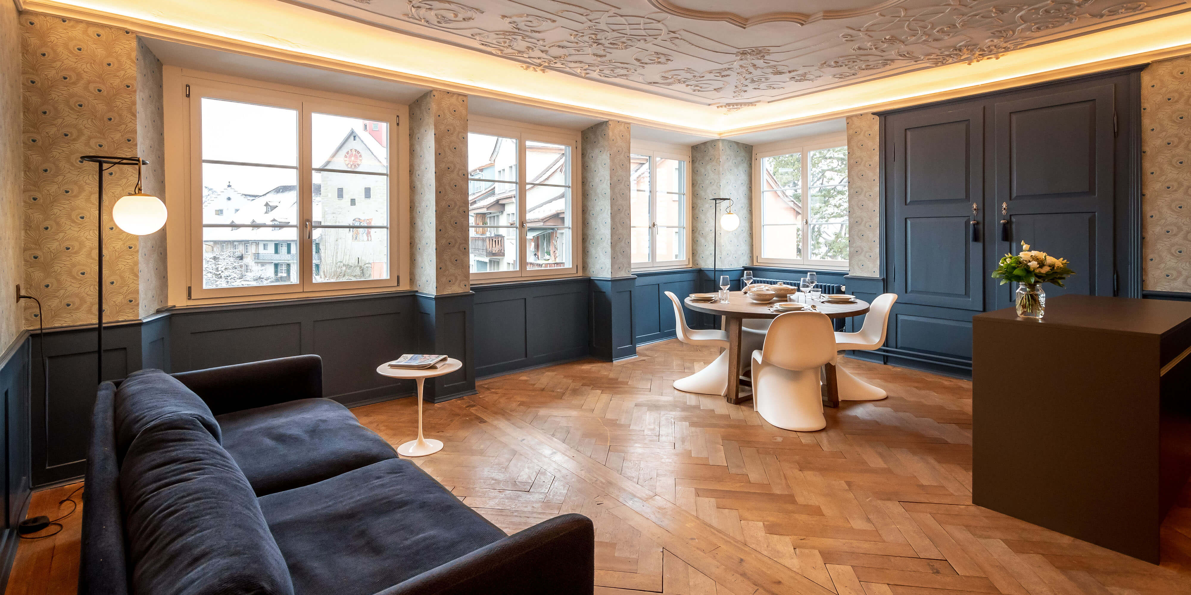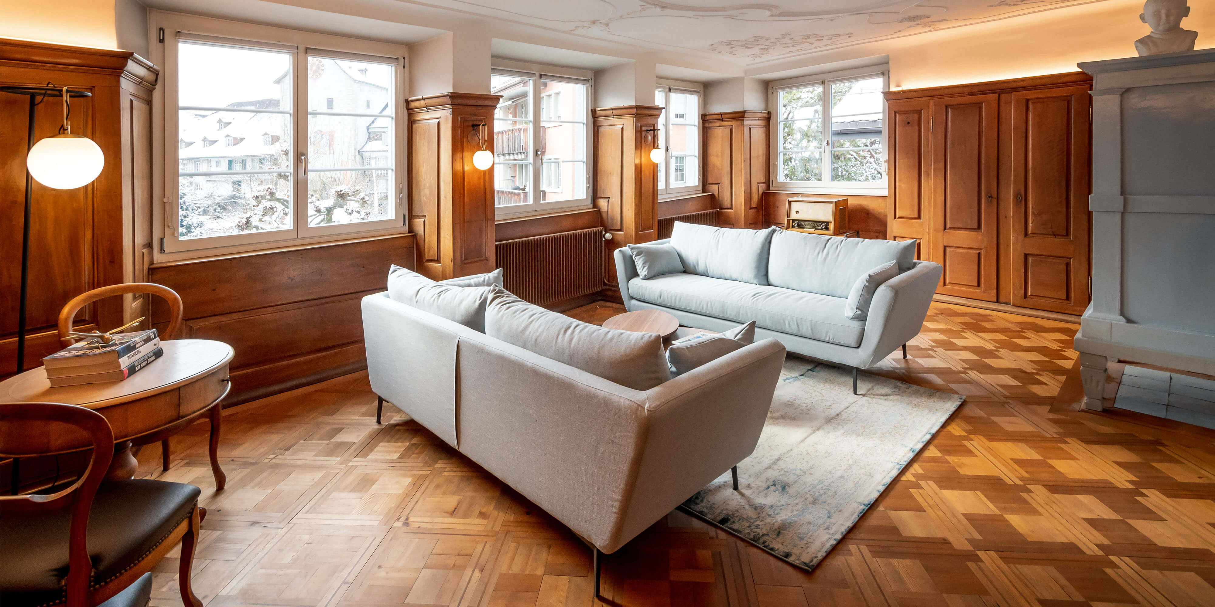 Die beeindruckenden Stuckaturdecken, historischen Holztäfer, massiven Türen und Holzriegel präsentieren sich nun in neuem Glanz gepaart mit modernem Design und hochwertiger Ausstattung.